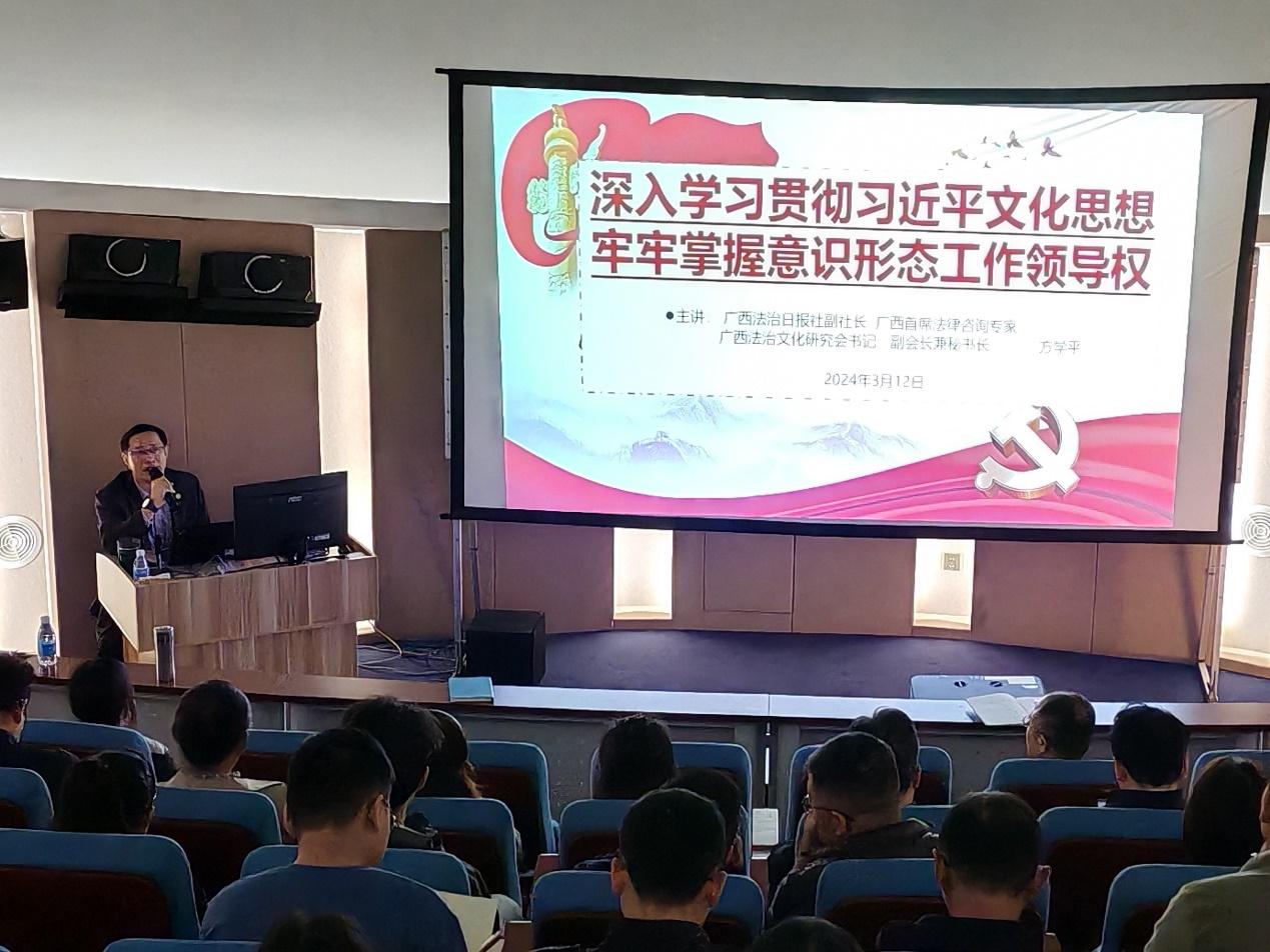 党委邀请了广西法治日报社副社长、广西首席法律咨询专家、广西法治文化研究会书记、副会长兼秘书长方学平做了题为《深入学习贯彻习近平文化思想牢牢掌握意识形态工作领导权》的专题报告。报告会由麻豆tv