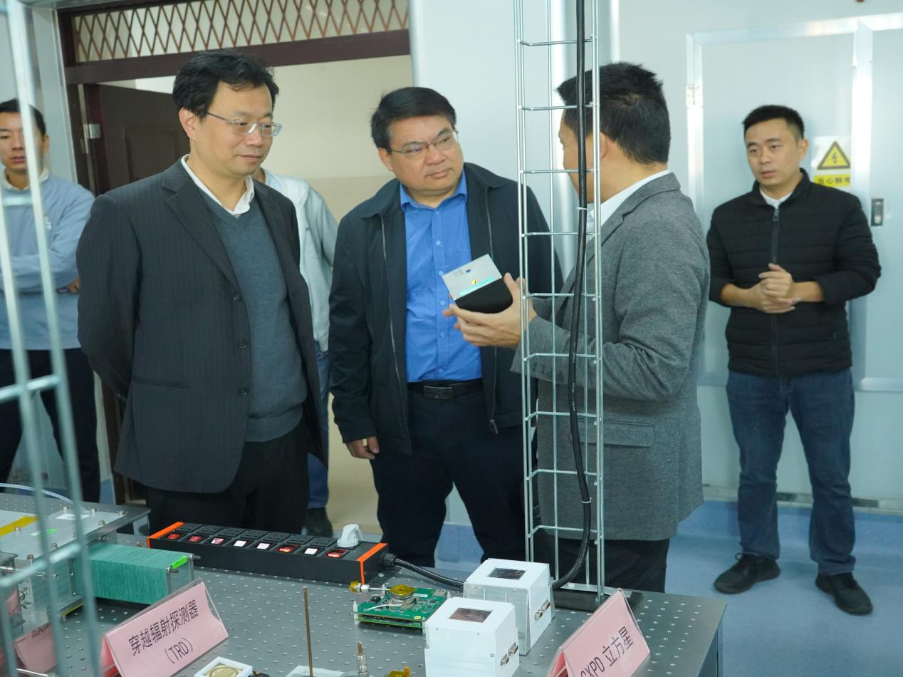 座谈会前,余林蔚一行还参观了学院科技成果展厅、洁净实验室、空间粒子探测技术实验室。
