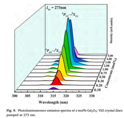 该论文采用光学浮区法生长了超高熔点(2700℃)Gd3+掺杂YSZ单晶体,并通过多种结构和光学表针技术,研究了Gd3+在YSZ晶体中的占位情况和发光性能。结果表明Gd2O3: YSZ晶体具有314 nm窄发射带,可能是一个潜在的光疗法应用候选晶体。