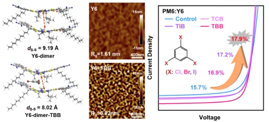 与此同时,“苯环和卤素”结合的固体添加剂与光活性层之间发生了怎样的相互作用以及这种相互作用是“同时调控给体和受体”还是“单一调控给体或者受体”仍然存在争议。针对此问题,薄膜光伏团队系统地研究了三种具有对称结构的“苯环和卤素”结合的固体添加剂,即1, 3, 5-三氯苯(TCB),1, 3, 5-三溴苯(TBB)和1, 3, 5-三碘苯(TIB)与PM6:Y6组成的光活性层间分子间相互作用的影响。研究结果显示,固体添加剂可以与非富勒烯受体(Y6,BTP-eC9,L8-BO)相互作用形成卤素键,改变二聚体的主链距离,增强受体分子的有序堆积,并诱导形成适当的“给体-受体”相分离。TBB对PM6:Y6的载流子迁移率、寿命、提取效率和载流子扩散距离有显著影响,实现了17.9%的光电转换效率。此外,添加剂增强了器件的稳定性和可重复性,对Y6衍生物受体表现出显著的普适性,二元PM6:BTP-eC9实现了18.2%的光电转换效率,二元PM6:L8-BO实现了18.8%的光电转换效率。我们的工作有助于更好地理解“苯环和卤素”结合的固体添加剂与非富勒烯受体的相互作用机制,有助于更深入地了解高效挥发性固体添加剂的结构设计,进一步为更理想挥发性固体添加剂的开发和设计提供理论和实验支持。