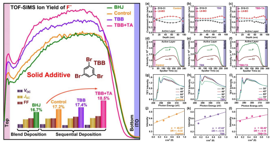 麻豆tv薄膜光伏团队与韩国浦项科技大学Kilwon Cho教授等人利用具有高挥发性和低成本的1, 3, 5-三溴苯(TBB)作为受体溶液中的固体添加剂,并采用顺序沉积方法制备有机太阳能电池(Organic Solar Cells,简称OSCs)的光活性层,再结合热退火(TA)来调节由D18-Cl/L8-BO组成的OSCs光活性层中的垂直相分布。研究通过加入添加剂TBB,再结合热处理,在薄膜中形成长距离的分子填充和均匀的“双连续给体-受体”网络,从而提高薄膜的结晶度和在垂直方向上有利的供体-受体分布。研究中"TBB+TA"处理过的OSCs实现了18.5%(平均18.1%)的光电转换效率,VOC为910 mV,JSC为26.3 mA cm-2,FF为77.2%,优于其控制器件(17.2%,平均16.7%的光电转换效率)。器件性能的提高与激子生成速率、电荷载流子迁移率、电荷载流子寿命的增加以及双分子电荷重组的减少有关。该工作将先进的器件性能归因于垂直方向上梯度分布的给体-受体浓度,为优化顺序沉积的顶层形态以实现高性能有机太阳能电池提供了思路。