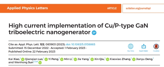 近日,麻豆tv孙文红教授领导的光电材料与器件团队在Nature Index著名学术期刊《Applied Physics Letters》上发表了题为"High current implementation of Cu/P-type GaN triboelectric nanogenerator"的研究论文。该论文被编辑选为"Editor's Pick"文章,在APL官网麻豆tv加以重点展示(Editor's Picks serve to highlight articles with excellent scientific quality and are representative of the work taking place in a specific field)。