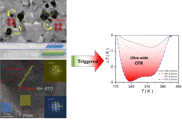 我们在SiN/p-GaN复合衬底和Pt/Si衬底上使用溶胶—凝胶法制备了掺Mn的BaTiO3薄膜(Mn-BTO)。结果表明,通过SiN/p-GaN复合衬底的调制作用,使得沉积在Pt/Si衬底上的Mn-BTO薄膜的负电卡效应由− 0.80 K提升至了− 2.94 K,同时工作温度范围(FWHMΔT)从136 K扩宽到了186 K。HRTEM测试证实了薄膜中间部位存在大量菱形相,这些菱形相极大地提升了薄膜的负电卡性能,同时验证了结构模拟计算的结果。该成果表明在SiN/p-GaN复合衬底上制备铁电薄膜可以在整个薄膜中形成纳米级的菱形相,从而大大改善负电卡效应,为在宽工作温度范围内制备高负电卡性能的薄膜提供了一条切实可行的途径。