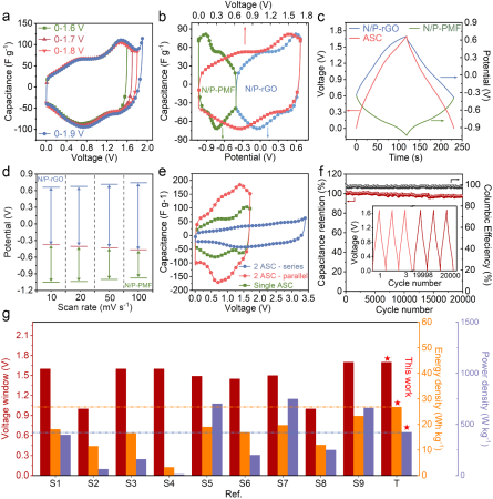 为了证明使用所制备的MXene和石墨烯基膜具有高度匹配的储能电位窗口和电荷存储动力学,我们组装了以N/P-PMF为阳极和N/P-rGO为阴极的非对称超级电容器(ASCs)。ASCs的CV曲线在不同电压窗口下验证了稳定的工作电压窗口可以扩展到1.7 V,并在出现极化之前甚至达到1.8 V。高工作电压窗口范围有助于提高非对称超级电容器的能量密度。同时在ASCs的充放电过程中,正负极能够在各自的稳定电位窗口内工作,并具有高度匹配的电荷存储动力学,确保了ASCs的高电荷存储性能和长使用寿命。因此,ASCs在保持高功率密度425 W kg-1的同时,实现了最大能量密度为26.8 Wh kg-1,并且在5 A g-1下经过20,000个循环后,ASCs保持了其初始电容的97.3%,表现出显著的可逆性和长期稳定性。这进一步验证了对二维MXene和石墨烯电极进行多孔结构设计与表面优化,可以构筑出具有匹配电化学性能的正负极,并有利于高性能ASCs的开发。