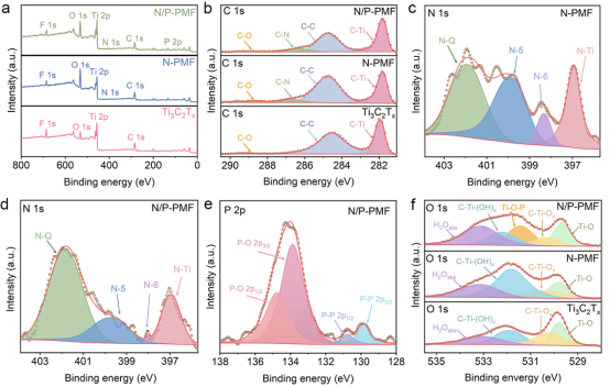 采用一步气体辅助发泡法设计并制备了具有氮、磷端子的多孔MXene 薄膜。通过选择性蚀刻Ti3AlC2获得少层 Ti3C2TxMXene 纳米片,并且使用球磨和超声分散法从块体黑磷中剥离出黑磷纳米片(BP)。然后,通过纳米片和铵离子之间的静电相互作用,将 MXene 和 BP 纳米片在碳酸氢铵(NH4HCO3)溶液中进行自组装。利用真空过滤收集复合膜,并在高温热处理后获得具有含氮、磷端子的多孔MXene膜(N/P-PMF)。在热处理过程中,NH4HCO3分解释放出的NH3和CO2气体在薄膜内构成了一个三维互联的多孔结构,并且NH4HCO3能够作为氮源实现对MXene的N掺杂。同时,BP能与MXene表面官能团反应并导致-OP端子的形成。并且,通过使用同样的方法,也能够制备出具有氮磷端子的多孔石墨烯薄膜(N/P-rGO)。