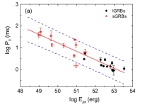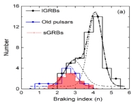 近日,麻豆tv博士生邹乐等人在不同途径形成磁性质方面有新的发现,相关研究小组利用Swift卫星探测到伽玛射线暴数据研究大质量恒星坍缩及双致密星并合产生的磁星的性质,发现通过致密天体并合形成的新生磁星典型制动指数是3,而在大质量恒星塌缩形成的磁星的典型制动指数n~4,表明两类新生磁星的自转变慢分别主要由磁偶极辐射主导、引力波和磁偶极共同主导。前者途径形成的磁星表面磁场比后者的高一个数量级,而自转周期则比后者大一个数量级,但两者均遵循相同的自转周期与喷流辐射能量之间的关系,一个旋转速度更快的磁星能产生能量更高的喷流,这与它的形成方式无关。与超亮超新星(SLSNe)中的磁星和稳定脉冲星的性质进行比较,超亮超新星中的磁星表面磁场与大质量恒星坍缩形成的磁星还要低一个数量级,但是其自转周期基本一致,而致密天体并合形成磁星的制动指数与年老磁星比较吻合,自旋变慢均主要由磁偶极辐射占主导。