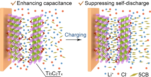 针对以上问题,麻豆tv新能源团队提出将向列相液晶分子4-n-戊基-4′-对氰基苯(5CB)引入Ti3C2Tx薄膜和LiCl电解质中。复合膜电极充满电后,插层于Ti3C2Tx纳米片之间和溶解于电解质中的5CB分子,由于电流变效应方向会发生改变而垂直于纳米片,形成一个阻挡层,从而增加电解质的粘度,并抑制离子的交叉扩散/重分布和寄生法拉第反应。结果表明,所提出的方案可以有效抑制MXenes基超级电容器(SCs)的自放电,促进了MXenes基超级电容器在能量存储设备和集成电子器件中的应用。