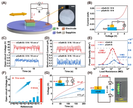 基于摩擦电效应的半导体摩擦电纳米发电机(TENG)具有直流电和高电流密度的特点,但其能量转移和转换机制尚不完全清楚。本文研究了一系列基于氮化镓(GaN)的半导体直流TENGs(SDC-TENGs),以阐明载流子的激发和输运机制。在摩擦过程中,由于半导体类型的原因,外部输出电流总是从氮化镓流向硅或铝,无论内置电场的方向如何。这些结果表明,载流子的输运方向主要由摩擦带电形成的界面电场决定,这在不同的偏置电压下也得到了验证。此外,还系统地研究了不同法向力和摩擦模式下摩擦力的特性。SDC-TENG的开路电压和短路电流均随着摩擦力的增大而增大,说明摩擦力越大,界面电场越大,摩擦也越大。
