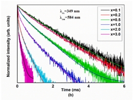 团队运用光学浮区法生长了一系列高质量的不同浓度Dy3+掺杂的YSZ单晶体,并结合多种结构和性能表针手段,研究了Dy3+:YSZ单晶体的微结构与光谱性能。结果表明,Dy3+之间的电偶极-电偶极相互作用导致了高浓度掺杂样品的发光猝灭现象,临界距离为1.86nm,发光位于黄橙光区,色坐标为(0.53,0.45)。