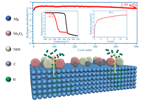 本研究本工作通过原位形成NbN和Nb2O5,提出了NbN和Nb2O5的协同催化作用机制。在NbN和Nb2O5的协同催化作用下,复合材料从178ºC开始释放氢气,在室温下即可吸收氢气,并且在90℃下1.95 min内,30℃下5 h内均能吸收5.0 wt%的氢。同时吸/放氢激活能大幅降低至37.7和78.1 kJ/mol。DFT计算进一步揭示了NbN和Nb2O5促进MgH2的Mg-H/H-H键断裂,从而提高材料的吸放氢性能。
