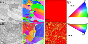 (a), (b), (c): as-cast Hf0.8; (d), (e), (f): the annealed Hf0.8; (a), (d): Band Contrast map; (b), (e): EBSD IPF maps; (c), (f): EBSD phase map (the BCC phases are colored by red, the HCP phase is colored by yellow). The crystallographic orientations of different grains in (b) and (e) are identified by the color scheme in the IPF triangle (g). [2]