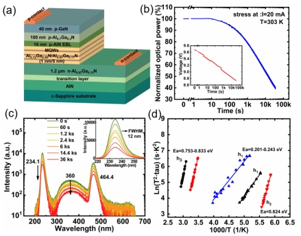 AlGaN基深紫外发光二极管(DUV LEDs)与传统汞灯相比具有诸多优点,被广泛应用于紫外固化、杀菌消毒、非视距通信等方面。但受限于材料特性以及器件制备工艺等问题,其发光效率和可靠性与蓝光LED相比较低,为解决此问题,研究人员对AlGaN DUV LED的可靠性展开了广泛研究。