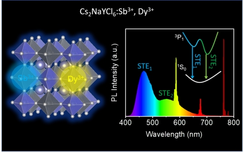 文章研究了温度对于掺杂稀土基双钙钛矿激发态能级的影响。文章里采用溶剂热法合成了Cs2NaYCl6:Sb3+, Dy3+双钙钛矿,实现了白光发射,光致发光量子产率高达70.7%。光学表征和理论模拟计算揭示了自陷激子到Dy3+离子的能量转移过程,Sb3+引入后打破了禁止跃迁,极大地提高了跃迁偶极矩。此外,在低温下观察到了Sb3+的低能自陷发射和Dy3+的双发射,双发射与3P1 → 1S0转变为两个极小值的不对称双激发态特征一致。发光光谱进一步表明,Dy3+离子在580和680 nm处的荧光强度比与温度密切相关,根据公式可拟合出在360 K时相对灵敏度高达1.79% K-1。近红外和辐射发光特性表明,Cs2NaYCl6:Sb3+, Dy3+双钙钛矿还具有良好的夜视和辐射探测前景,在固态照明和光学温度测量方面也有巨大的应用潜力。