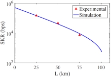 图三 不同距离下的安全密钥率。蓝色实线为理论仿真结果,红色三角为实验结果,分别对应25km,50km和75km。