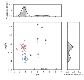 统计分布(右图)也显示了在P~7.5×10-13处分界线的双峰分布。红星表示的“高
