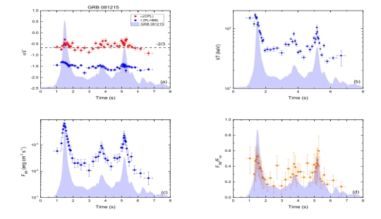 图3. GRB 081215的α和Γ (a)、kT (b)、FBB (c)和FBB/Ftot (d)的时间演化。