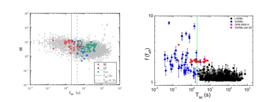 图1. 左图:我们的SGRB with EE样本和其他长、短伽马射线暴的HR-T90散点分布图。右图:我们的SGRB with EE样本和其他长、短伽马射线暴的有效振幅feff-T90散点分布图。