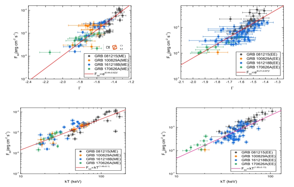 图4. 四个GRB (081215, 100829A, 161218B和170626A)的ME和EE相的Ftot-Γ,Ftot−kT相关性。