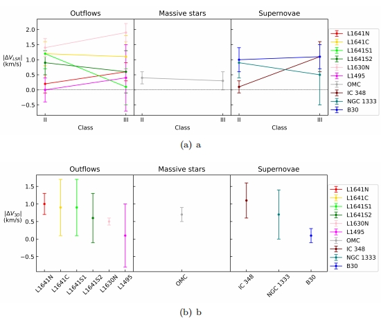 绝大多数恒星成团地形成于分子云中中,随后演变成星团、星团或孤立的恒星,并最终逐渐融入银河系的引力场中。年轻恒星(YSOs),作为非常年轻且仍然与其母分子云相关联的天体,可以用于揭示恒星形成过程中的运动学特征。在恒星形成过程中,各种反馈环境,如原恒星外流、大质量恒星的恒星风和H II区,以及超新星爆炸,会向恒星形成区注入动量。这些反馈过程在理论上能够扰动周围的物质,并可能影响分子云内新形成恒星的运动学。然而,目前尚缺乏将YSOs的运动学特征与其母分子云进行比较的研究,这正是我们研究的目的。