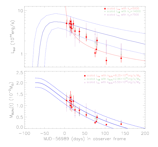 Fig. 1: Top panel shows the evolution of continuum luminosity (bolometric luminosity). Bottom panel shows evolution of broad Hα and the best descriptions related to our proposed mass evolution model.