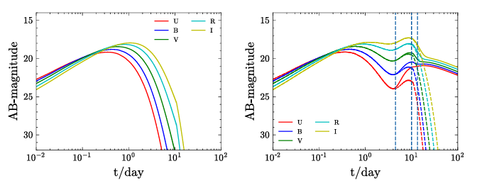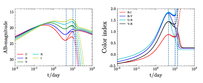 图2:考虑到多种能量来源,千新星的光曲线(左)以及颜色演化(右)。