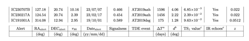 我们对ZTF-BTS目录的TDE与IceCube中微子种群之间的相关性进行了分析。考虑到良好的空间定位对相关性分析很重要,我们采用两种方法处理误差圈较大的报警事件。一种方法是排除大误差圈事件,而另一种方法引入了加权因子。我们使用三种MC模拟方法研究了冰立方中微子与ZTF-BTS星表中TDE之间的相关性。通过MC模拟,我们发现带有红外耀发TDE的子样本与IceCube中微子的相关性最为显著,其偶然概率大约为0.77%。这个最显著的相关性是由AT2019dsg和AT2019azh所贡献的。其中AT2019dsg是首例报道于Nature astronomy的可能的作为IceCube高能中微子辐射源的TDE。对于AT2019azh,我们发现其与两个高能中微子满足时空成协,如表1所示。