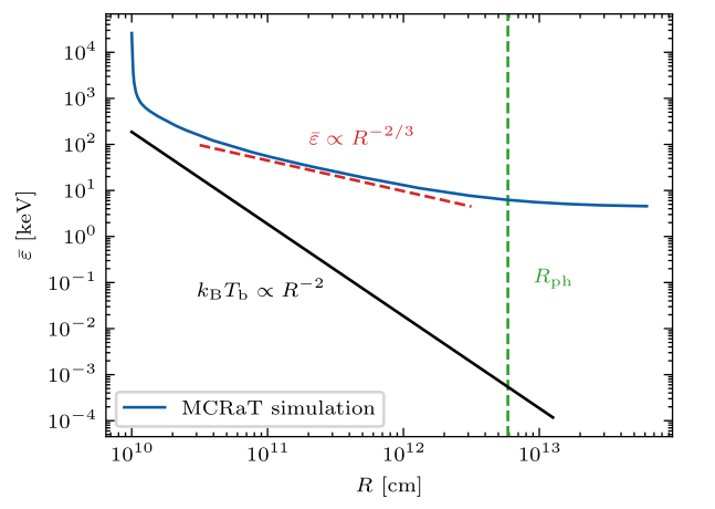 研究重点分析了湍流在光子与电子弱耦合区域的作用。图1展示了光子热化过程随喷流半径的演化:通过对比光子平均能量与电子温度的变化,发现光子在光球层下方广泛区域内存在弱热化效应,支持湍流对辐射场的有效扭曲。