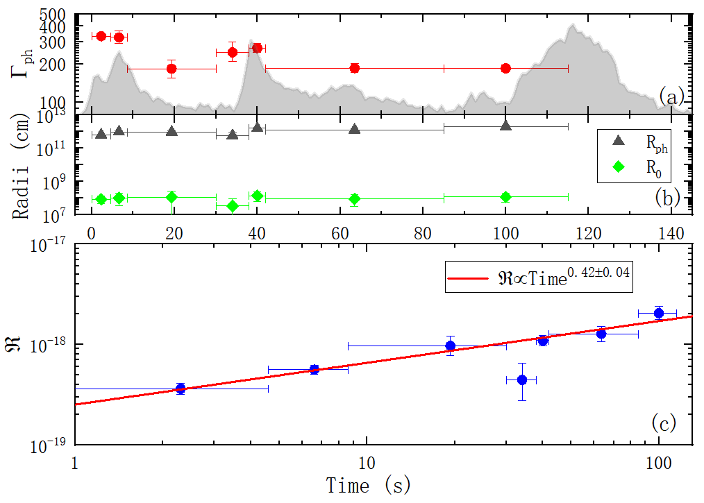2. (a)Γph的时间演化。(b) 火球半径(R0Rph)的时间演化。(c) 推导的 R 随时间的变化关系。